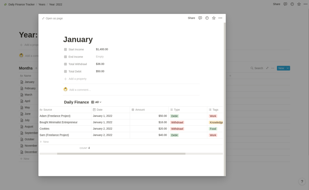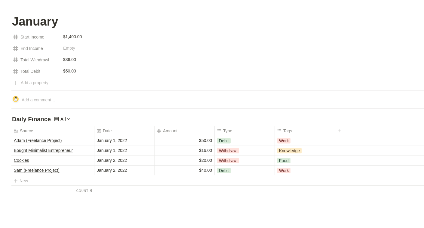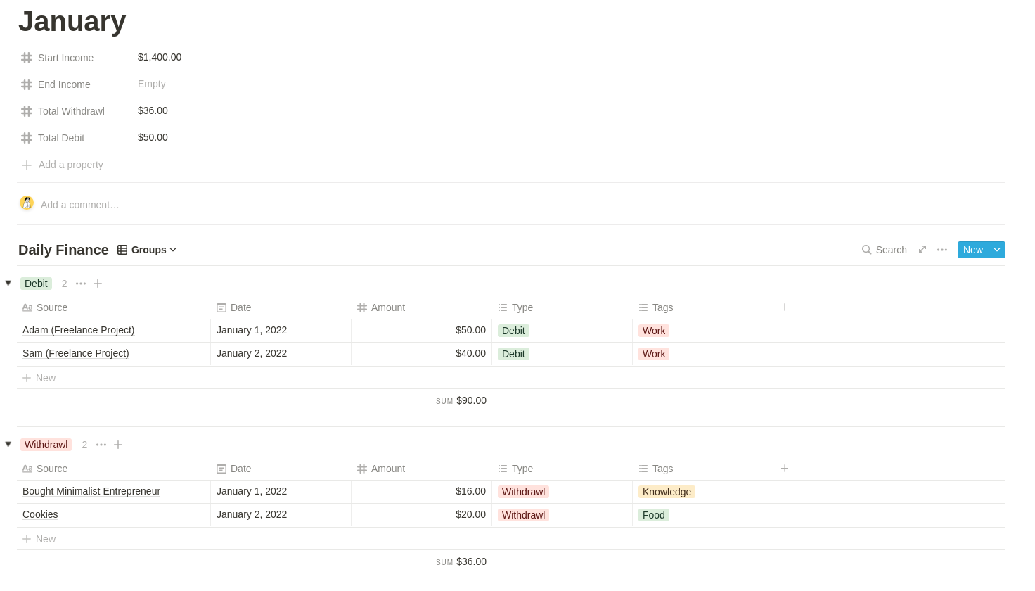 4) Fields: Source, Date, Amount, Type: Debit or Withdrawl, Tags